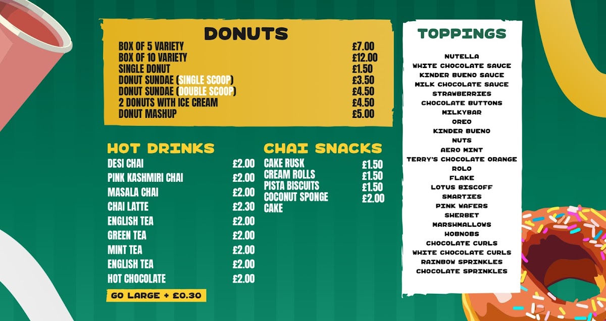 Step inside, and you’ll be enveloped by an inviting atmosphere filled with the rich aroma of spices and sweet confections. The vibrant decor and welcoming vibe create an ideal setting for relaxation or casual gatherings with friends. Whether you're catching up over a cup of chai or unwinding with a donut, the ambiance here makes every moment delightful.