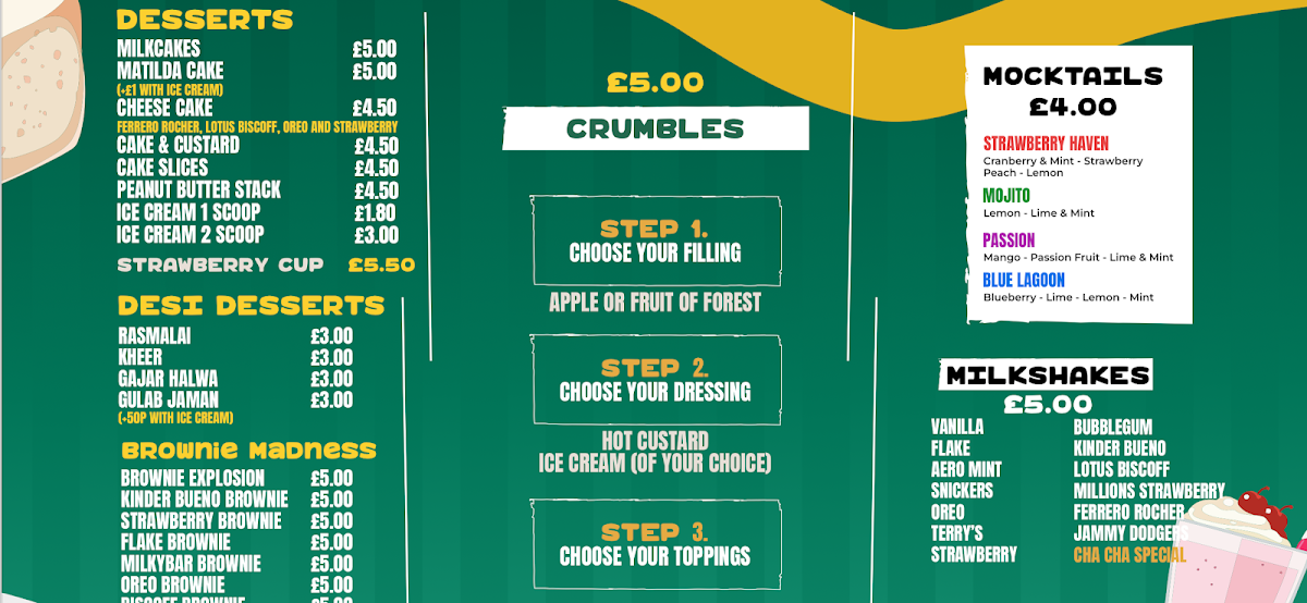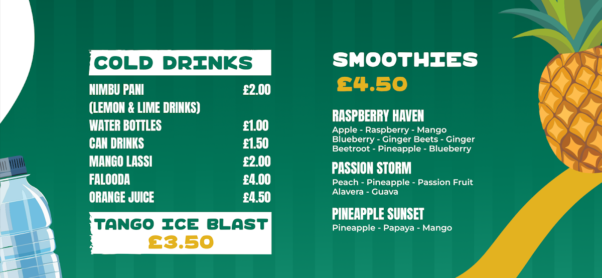 If you're in the mood for something refreshing, their cold drinks section offers an enticing selection. From a tangy Nimbu Pani for just £2.00 to a luscious Mango Lassi at £2.00, there’s something to quench every thirst. Smoothie enthusiasts will also be pleased with options like Raspberry Haven and Passion Storm, both priced at £4.50, perfect for a flavor-packed boost.